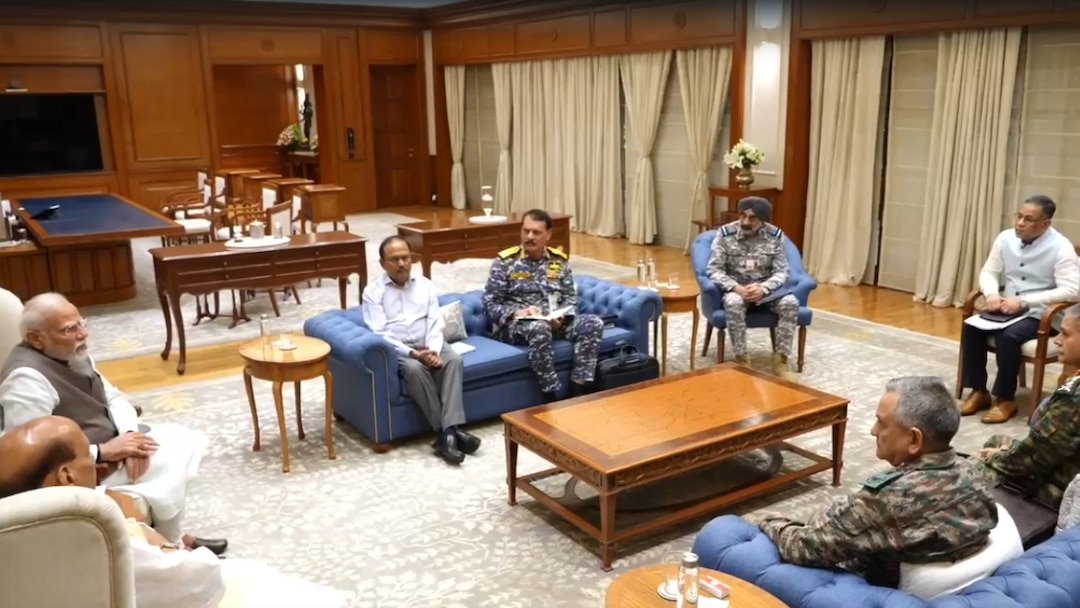 प्रधानमंत्री आवास पर तीनों सेनाध्यक्षों की पीएम मोदी के साथ मीटिंग चल रही है. इस मीटिंग में नेवी चीफ, एयरफोर्स चीफ और आर्मी चीफ के साथ ही सीडीएस भी मौजूद हैं. थोड़ी देर पहले ही MEA की प्रेस ब्रीफिंग हुई थी. इस अहम बैठक में एनएसए अजीत डोभाल भी शामिल हैं. रक्षामंत्री राजनाथ सिंह भी मीटिंग में शामिल होने के लिए थोड़ी देर पहले पीएम आवास पहुंचे हैं.